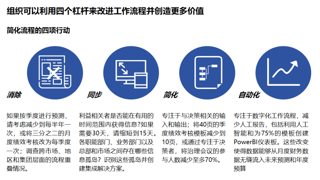 精简:您的治理会议是否仅由决策者参与,还是涉及过多利益相关者?应尽可能精简不必要的会议、缩减参会人员。若当前按季度开展预测,可考虑调整为每半年一次。不同市场、地区及集团层面是否存在相同流程的重复执行?需排查重叠环节与延误成因。​